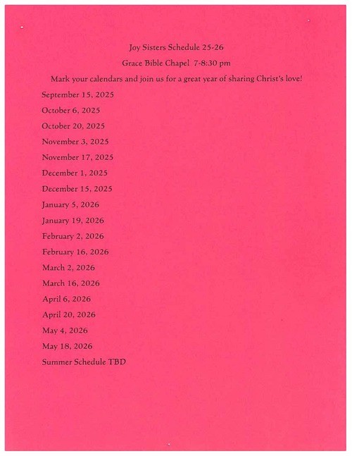 Joy Sisters is a fun Women's Ministry that meets on the 1st & 3rd Mondays of each month from 7-8:30pm at Grace.
